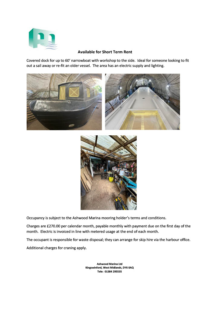 The dock is available for both DIY blacking or blacking by Steve. Steve can also fit replacement annodes and assist with other requirements such as rudder works, weed hatches etc